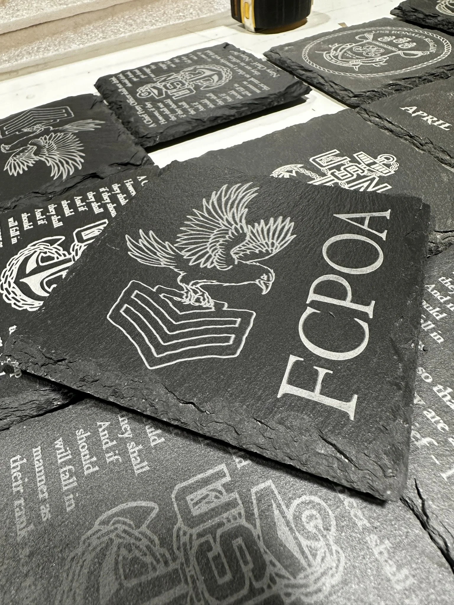 Categories: All Coin Holders Season2020 Accessories All | Coin Holders | Season2020 | First Class Petty Officer (Navy) Slate Coasters Set of 4 $30.00 Hardwood Valet Tray - Customizable from $50.00